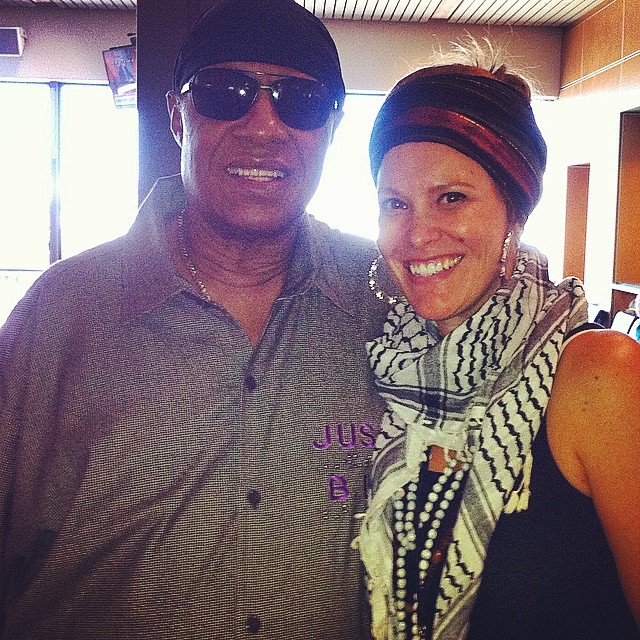 Oh my goodness, THIS IS REALLY HAPPENING!!! I clumsily fumble with my guitar as I take it off and am beginning to feel myself tremble…I remind myself to breathe and walk towards the legendary Stevie Wonder!!! He greeted me with a sincere smile and a warm embrace. His energy was so pure…He absolutely radiated love and light. I think I said something to the effect of “Thank you for your amazing work, you are my hero, it’s an honor to meet you, etc…but honestly much of the initial meeting is kind of a blur. I felt completely out of my body at that moment. He asked if I was the songwriter of the songs he had heard and I replied that I was. He complimented my voice and style then proceeded to ask who I was signed with. I told him that I wasn’t signed with anyone and then he asked for my card!!! Of course I gave him one along with both of my albums. We chatted briefly for a couple more minutes, got some photos and exchanged goodbyes just as he was being bombarded by a crowd of fans. At that point the only thing that made sense to do was to keep on singing. So that’s what I did..I picked up my guitar, stepped back up to the mic and carried on while he was just a few feet away taking photos with people.